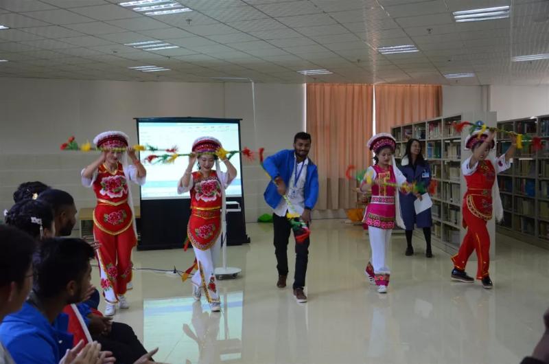 活动开始,我院志愿者带领留学生感受了学校的学习氛围、生活氛围,在第一报告厅通过VCR向他们介绍了大理,通过“三道茶”让留学生深入了解到大理的风土人情、人文历史。随后又由本院的学生展演了代表白族特色的霸王鞭等四个节目。