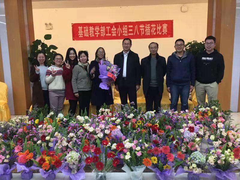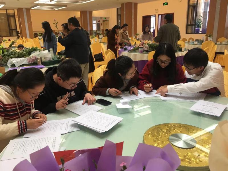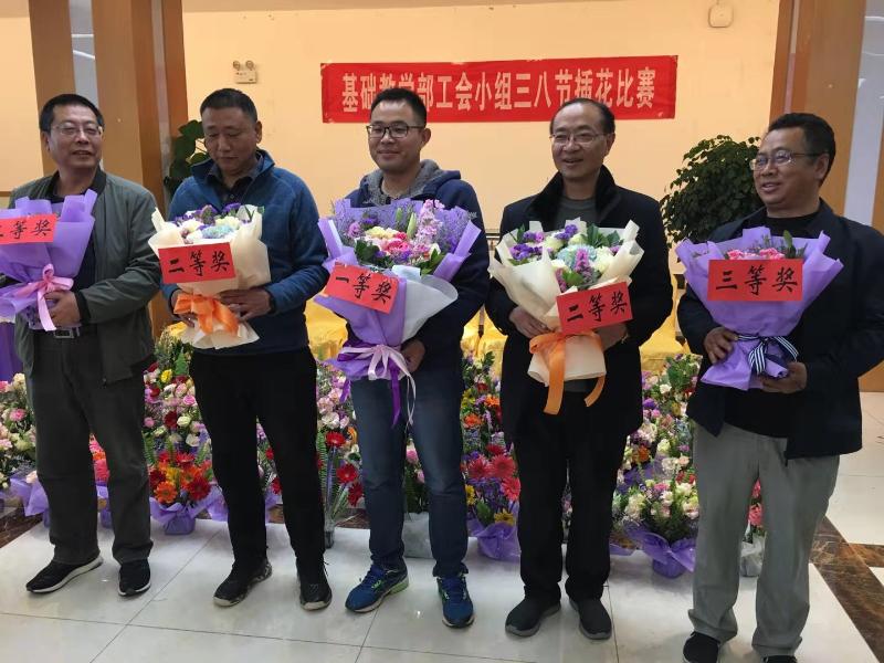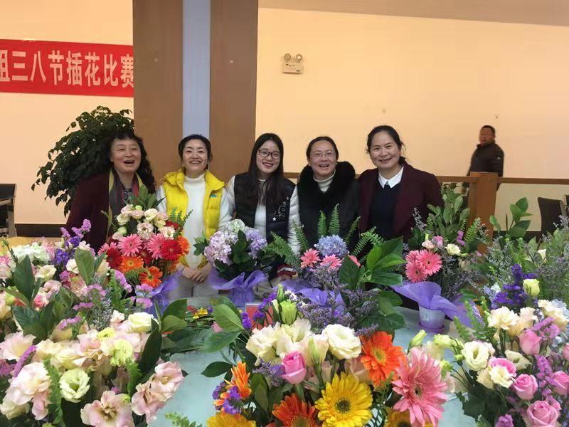 花艺讲座后,分五组开展插花比赛。男教师担任组长,积极为女教师进行后勤服务,搬运和分发花材。女教师们面对鲜花,笑容灿烂、柔情似水、心情愉悦、全神贯注,变化着不同的姿势,完全沉浸在五彩斑斓花的世界中,感受着鲜花的缤纷和美丽。男教师们也不甘示弱,纷纷参与到活动中,插着心仪的花束。活动在欢乐的气氛中进行,插花比赛结束后,评委评选出最美的花束,活动在欢乐的气氛中进行。