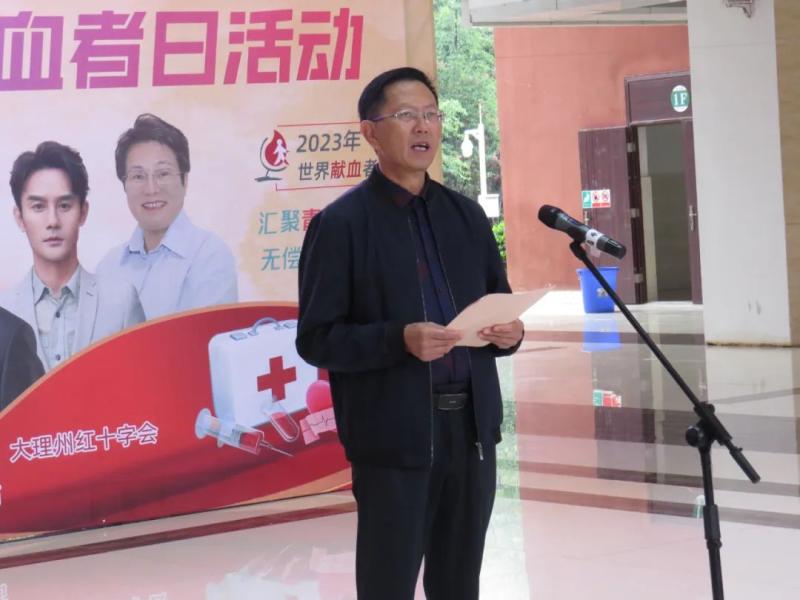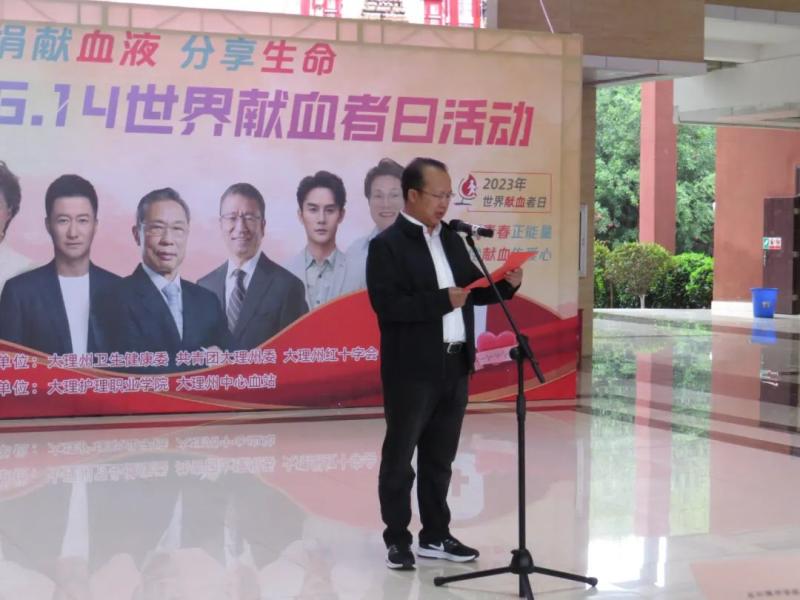 州卫健委副主任李宏军在讲话中指出,近年来,大理州无偿献血事业发展取得的成绩显著,无偿献血事业是推进健康大理建设、建成滇西区域医疗中心的基础性、保障性工作。他对我校师生积极参与无偿献血活动宣传、带头献血表示衷心的感谢!希望,广大师生积极参与到无偿献血工作中来,共同推动大理州无偿献血事业迈上新台阶。他宣布,第二十个“世界献血者日”活动启动仪式开始。