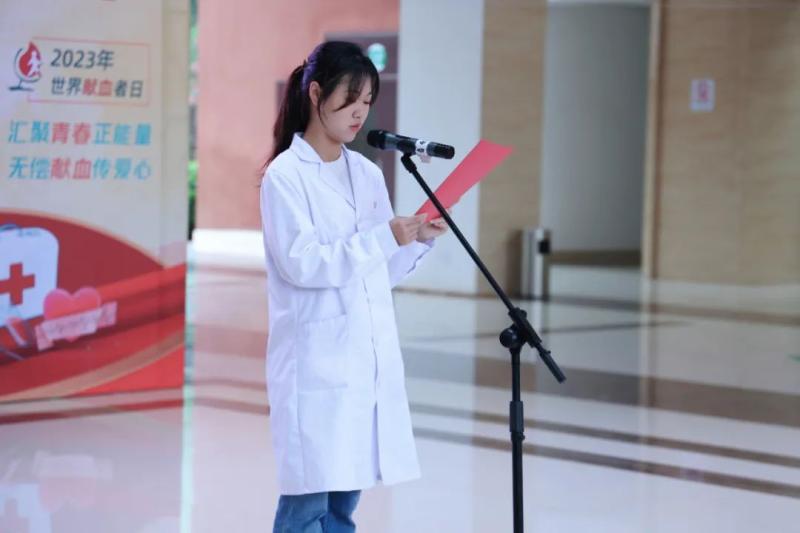 我校学生潘玥含作为青年无偿献血志愿者代表发言。她分享了个人参与无偿献血志愿服务活动的心得与感悟,并向广大志愿者发出倡议:同学们积极参与献血活动,成为无私奉献的榜样。无论是在校园内还是校园外,同学们都应该传递爱心和关怀,让这个世界变得更美好。