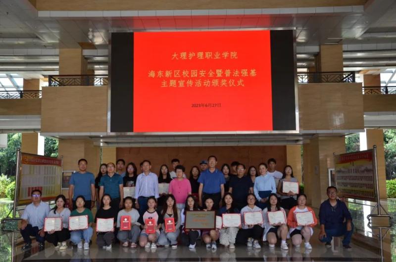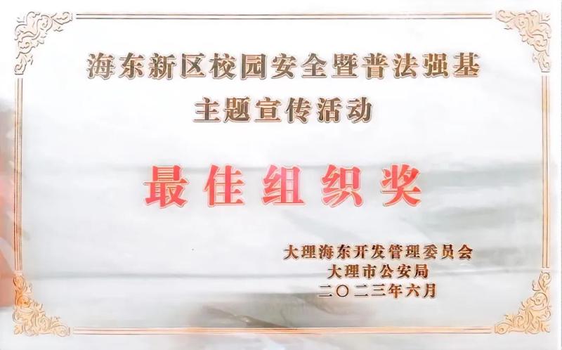 6月27日,大理海东开发管理委员会、大理市公安局给我校颁发了“海东新区校园安全暨普法强基主题宣传活动最佳组织奖”,学校领导为获奖同学颁发获奖证书。