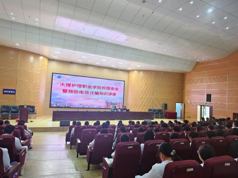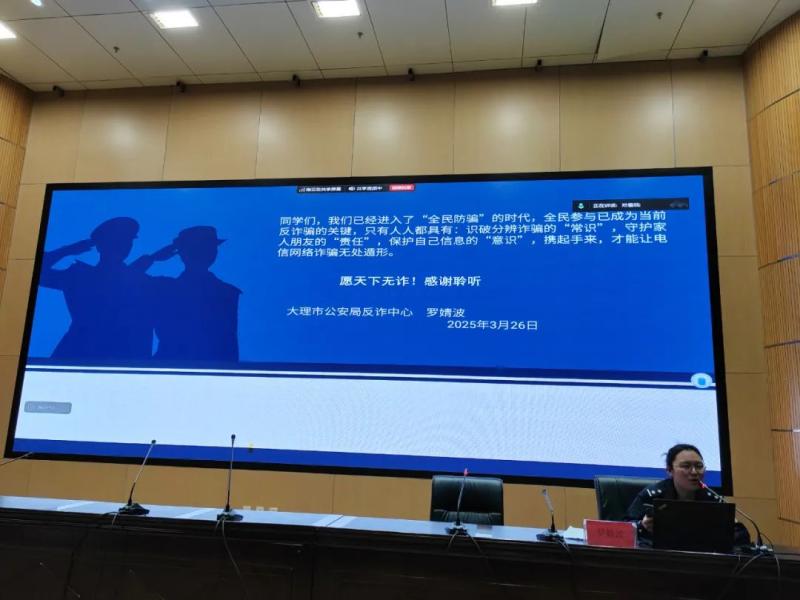 3月26日,bat365官方官网邀请大理市公安局罗婧波警官到校为全校师生开展预防电信诈骗筑牢校园安全的专题讲座,进一步抓牢校园安全和学生法治教育,扎实推进平安校园建设。全校在校班级240余名学生代表在学校第二报告厅现场参加讲座,3600余名学生在各班教室通过多媒体线上同步认真聆听讲座。讲座由学生科科长陈勇主持。