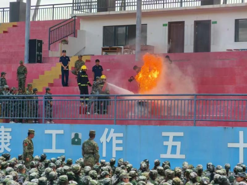 活动中,张雨豪副站长结合实际消防安全案例,为全体师生带来了一场内容丰富、实用性强的消防知识培训课程。他详细讲解了火灾发生的原因、预防火灾的措施以及火灾发生时的正确应对方法,重点演示了灭火器的使用技巧和方法。随后,军训新生代表踊跃上台,进行了灭火器实操体验,亲身感受灭火过程,进一步加深了对灭火技能的理解和掌握。