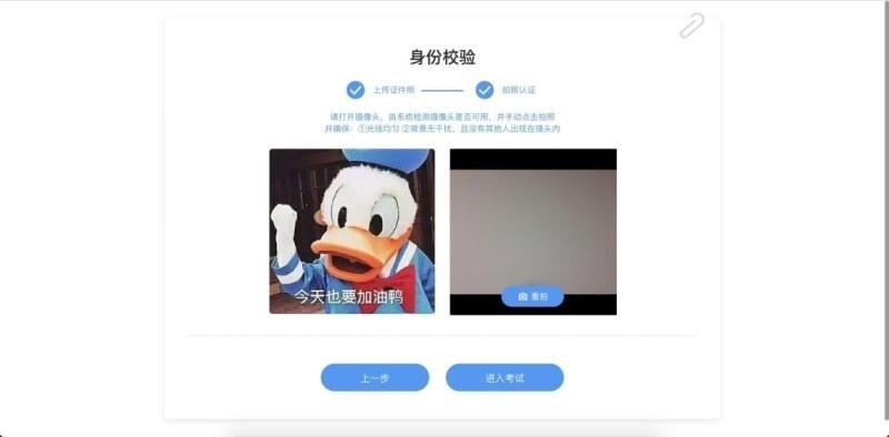 考试前 30 分钟内均可进行身份验证,请同学提前准备好身份证正面照片,并按要求上传证件照、进行拍照认证,摄像头拍照后,即可进入考试。