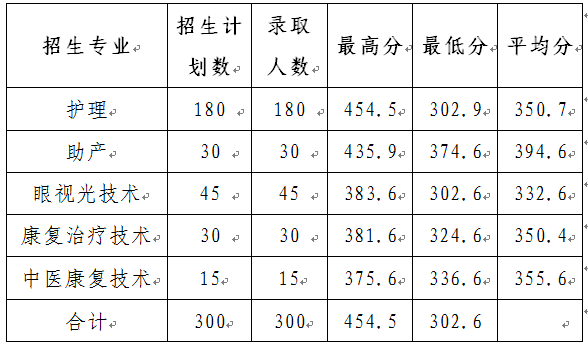 2017年8月1日bat365官方官网高职专科“三校生”类300人录取全部结束,最高分454.5分,最低分302.9分,其中护理专业最低分302.9分,超控制线197.9分;助产专业最低分374.6,超控制线269.6分;眼视光技术专业最低分302.6分,超控制线107.6分;康复治疗技术最低分324.6分,超控制线129.6分;中医康复技术最低分336.6分,超控制线141.6分。录取结果为: