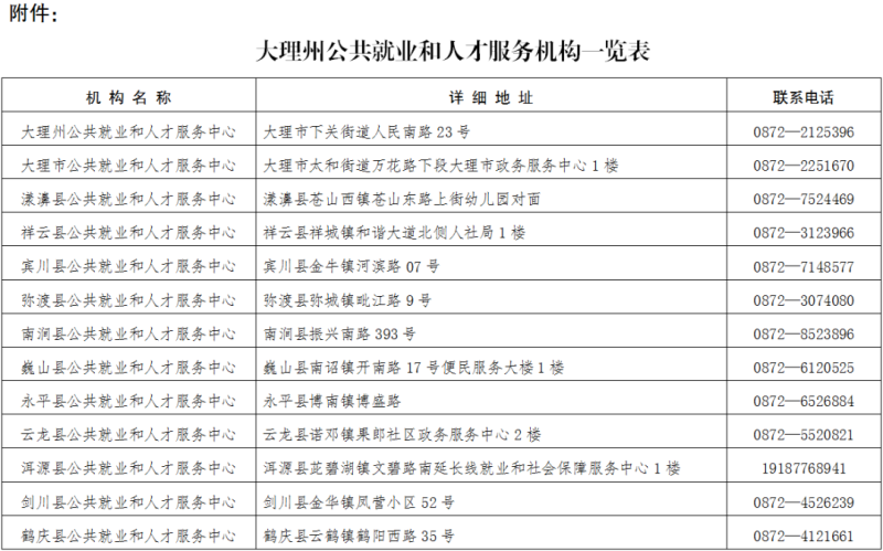 附件:大理州公共就业和人才服务机构一览表