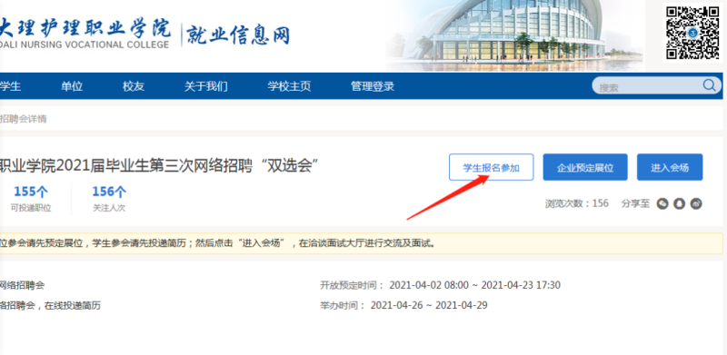报名方式:登录护理职业学院就业信息网(网站网址:http://dlhlzyxy.jysd.com/),或扫描下方二维码登录。登录后的后续操作详见附件1。