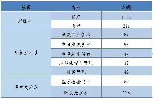 我校2024届有护理、助产、医学检验技术、眼视光技术、健康管理、康复治疗技术、中医康复技术、中医养生保健及老年保健与管理9个专业高职专科毕业生共1851人,具体专业分布如下表: