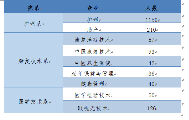我校2024届有护理、助产、医学检验技术、眼视光技术、健康管理、康复治疗技术、中医康复技术、中医养生保健及老年保健与管理9个专业高职专科毕业生共1834人,具体专业分布如下表: