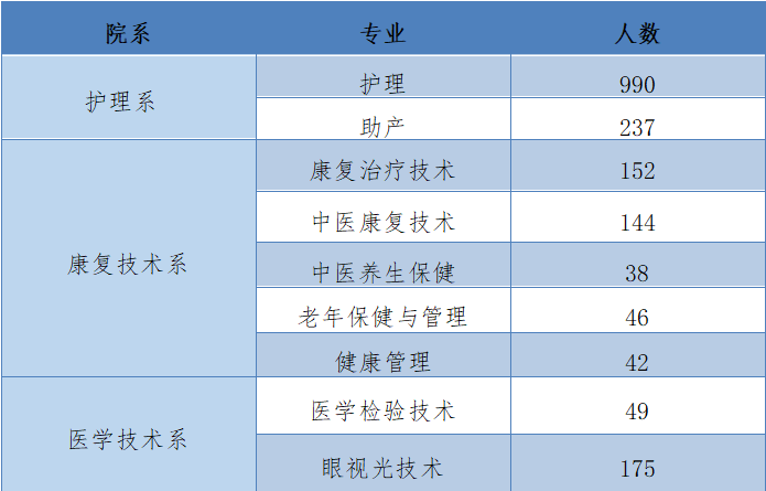 我校2025届有护理、助产、医学检验技术、眼视光技术、健康管理、康复治疗技术、中医康复技术、中医养生保健及老年保健与管理9个专业高职专科毕业生共1873人,具体专业分布如下表: