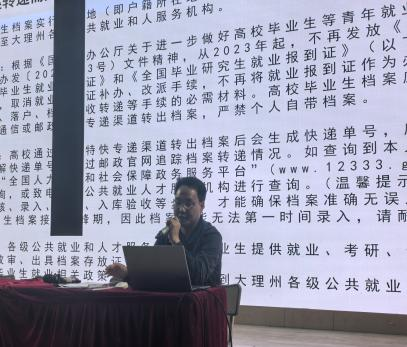 共筑职业梦想桥梁,深化就业创业服务。3月31日下午,由大理州公共就业和人才服务中心主办,bat365官方官网协办的“就业政策进校园,典型引路伴起航”2025年大学生就业政策宣讲暨创业典型分享会在我校一号报告厅举行。本次活动旨在深化学生就业创业服务,为我校大学生提供最新的就业创业政策解读和宝贵的经验分享,助力学生开启职业发展新篇章。学校郭向周副院长、大理州公共就业和人才服务中心王浦副主任、人才服务科陈爱斌科长、创业培训科赵东海科长、白族扎染艺术家张翰敏老师等领导和专家莅临指导。活动由学生科陈勇科长主持。